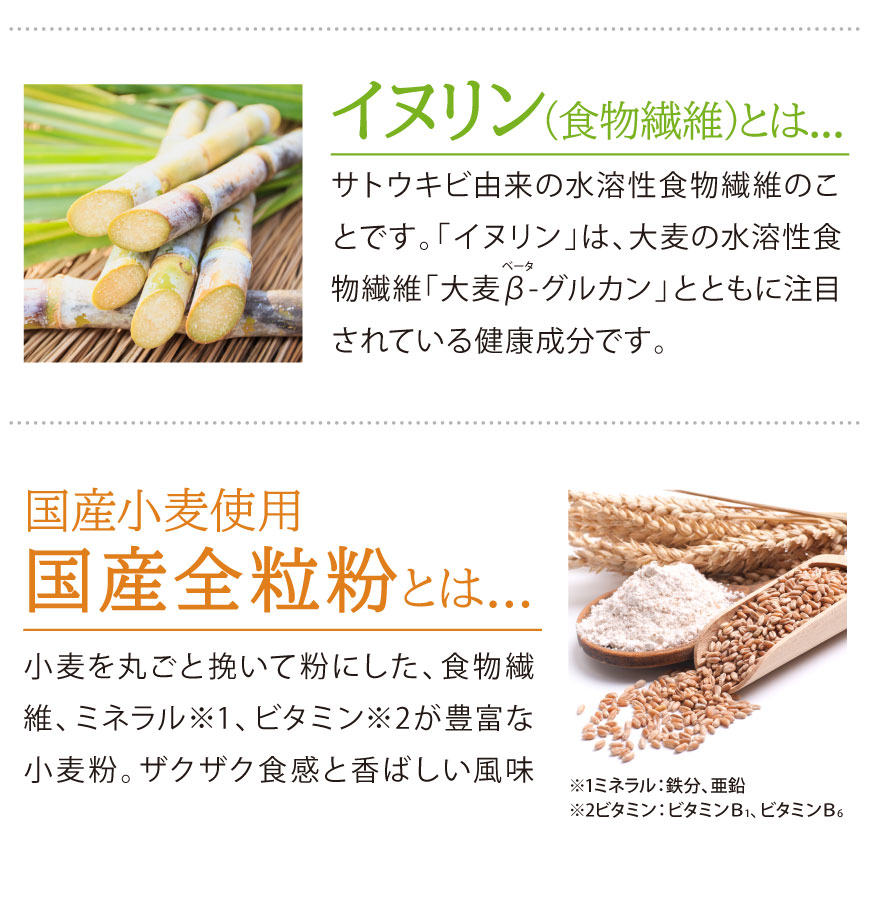 小麦粉(小麦(国産))、小麦全粒粉、ショートニング、ブラウンシュガー、三温糖、もち麦パフ、イヌリン(食物繊維)、砂糖混合ぶとう糖果糖液糖、マーガリン、岩塩/膨脹剤、香料、(一部に小麦・乳成分・大豆を含む)